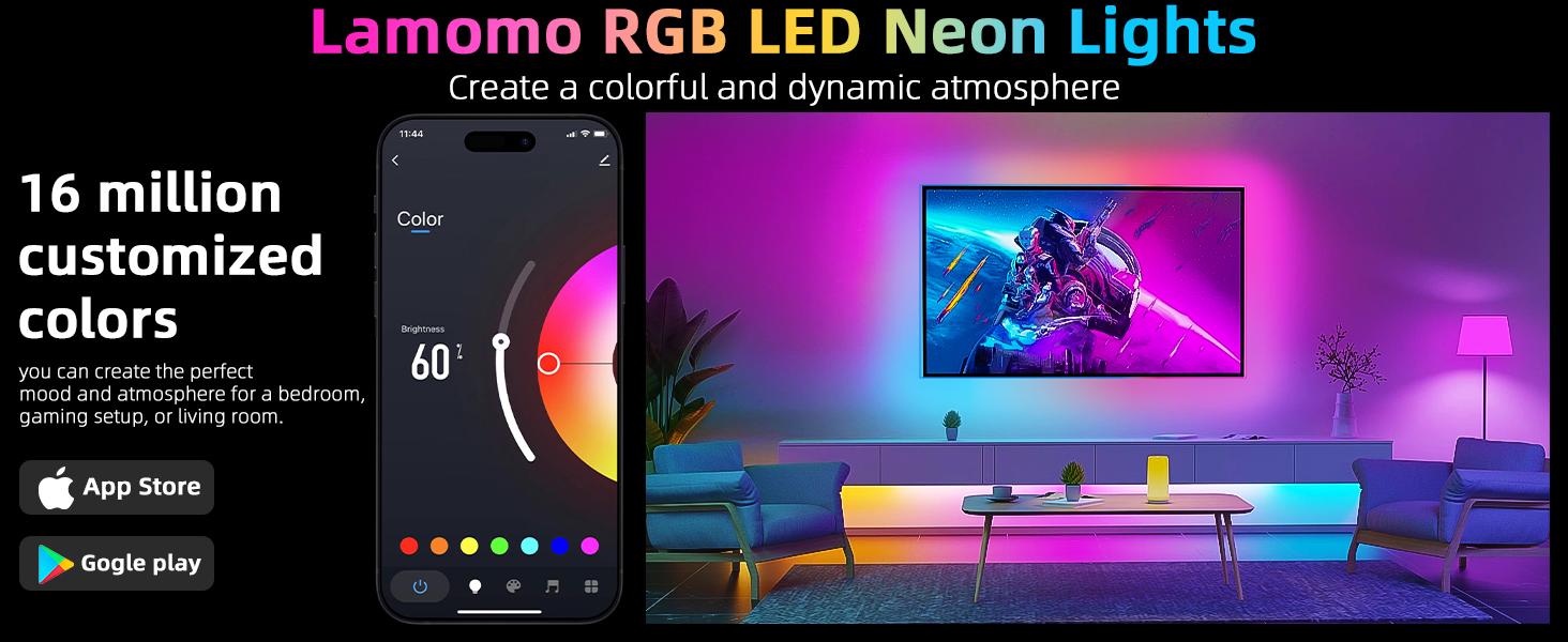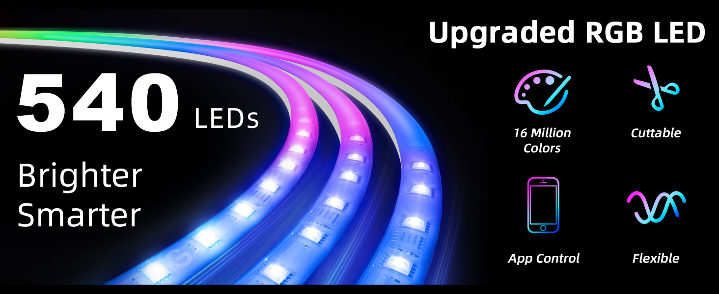 High Brightness:The neon rope lights include 540 super bright RGB LEDs with 12V working voltage. Upgraded LED and Side-Brightness Design Make LED strip Lights Shine Brighter than others, 120 Degrees Projection Range offers Large Illumination Coverage, and the Light is very even down the Strip